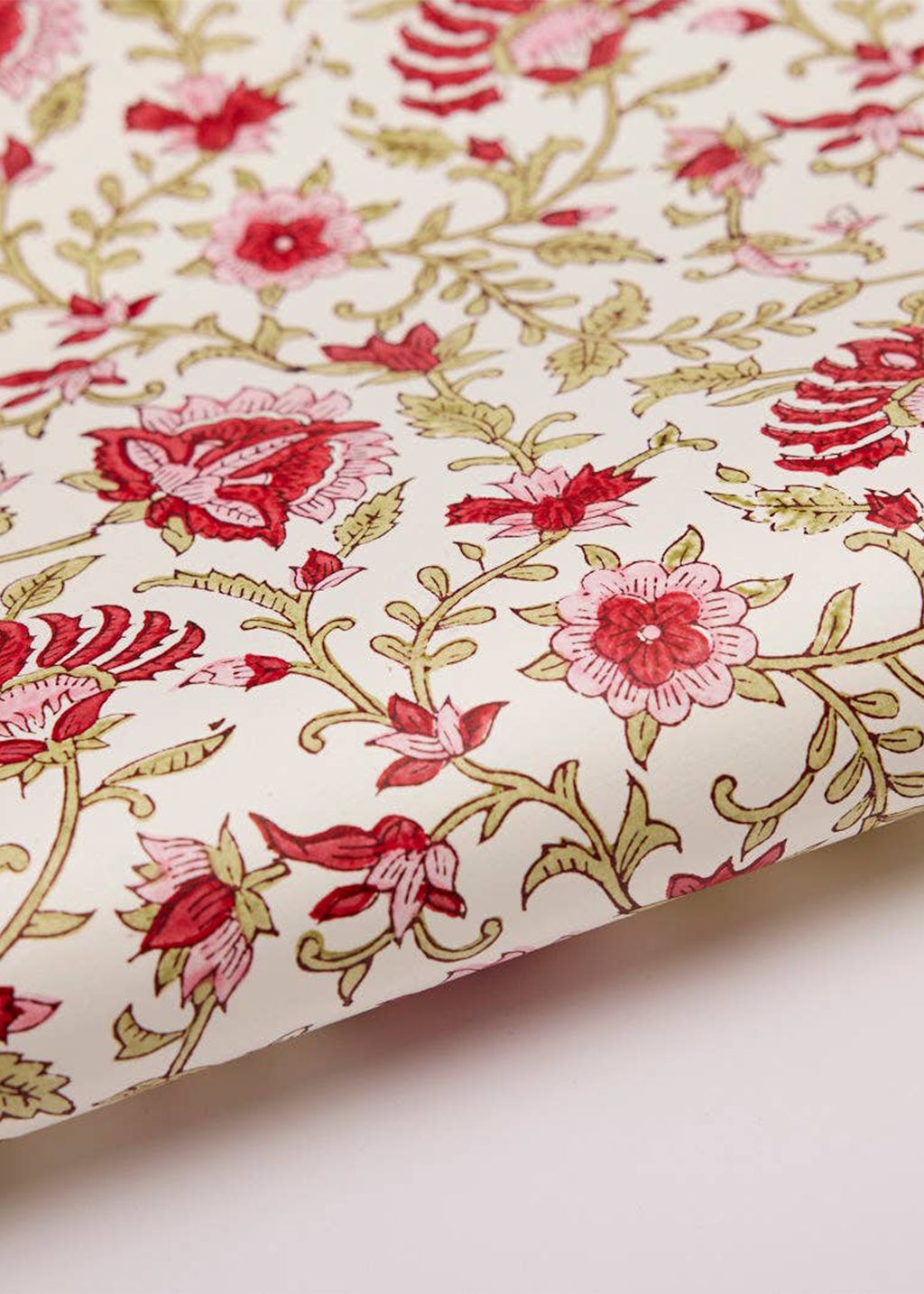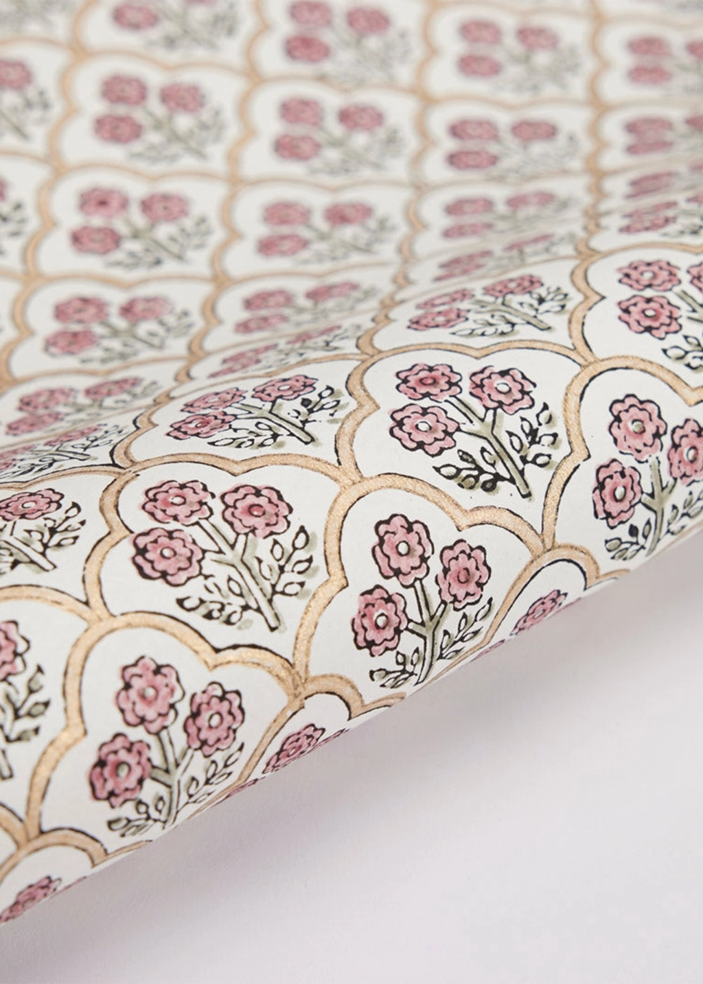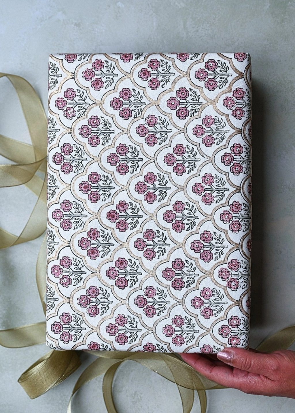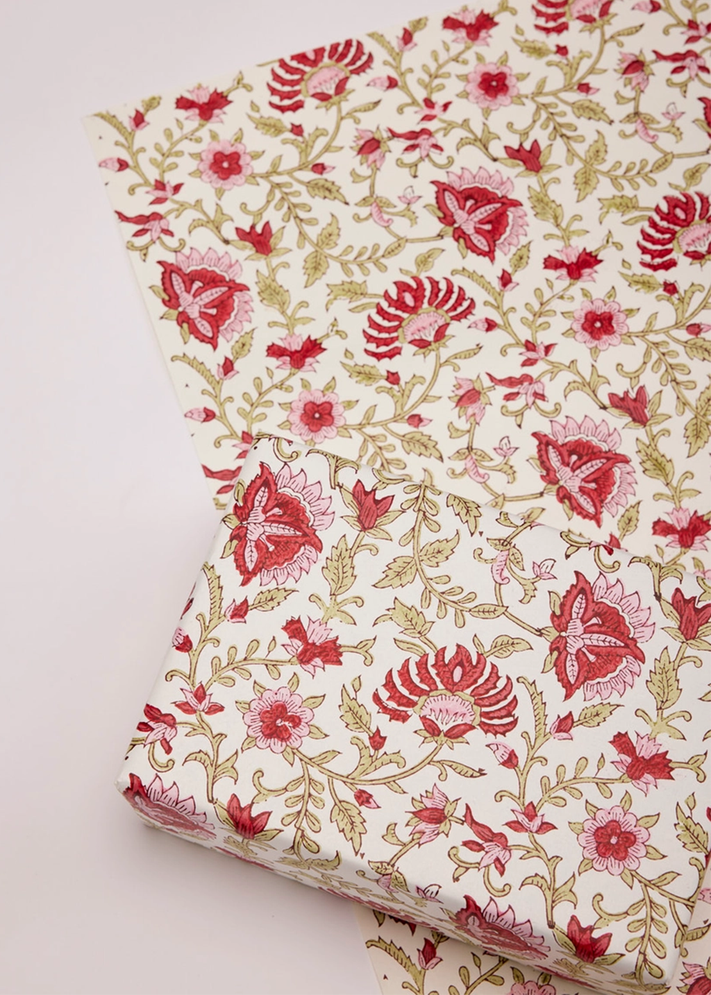 This beautiful range of premium gift wrap is hand block printed on ivory cotton paper using 2 or more colours. A separate wooden block is used for each colour application. Symmetry forms the core of the design and pattern repeats must be perfectly balanced.