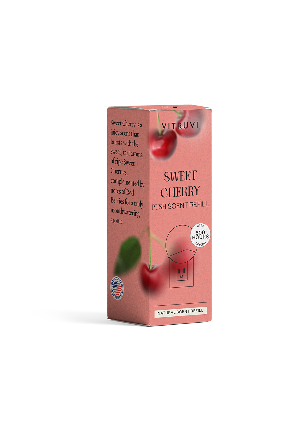 For use with Vitruvi Push Plug-In Wall Diffuser Sweet Cherry is a juicy scent that bursts with the sweet, tart aroma of ripe Sweet Cherries, complemented by notes of Red Berries for a truly mouthwatering aroma.